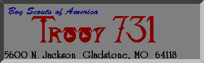 Scouting is far from dull. Especially when you're around our troop. In other words, Small Troop; Small People; HUGE FUN. Of course, I may just be opinionated, being one of them, and all, but you can find out for yourself. If you are in the North Kansas City, MO School District, just come to the address on the above graphic. We are run by Volunteer leaders from the Shoal Creek Ward of the Liberty, MO Stake of the Church of Jesus Christ of Latter-Day Saints, but you don't have to be a member to come. Because of the Volunteer system, no dues are required--but we do take donations. All you need to be able to do is learn, grow, and, most imprtantly, be able to put up with those people we like to call "Scouts". Oh! And, if you are easily offended by references to "farts," violence, and other comments which come up in boys' daily dialog, please don't risk coming. The links to the left may or may not be running, this site being around since 4-19-2001, and me not being able to update much.